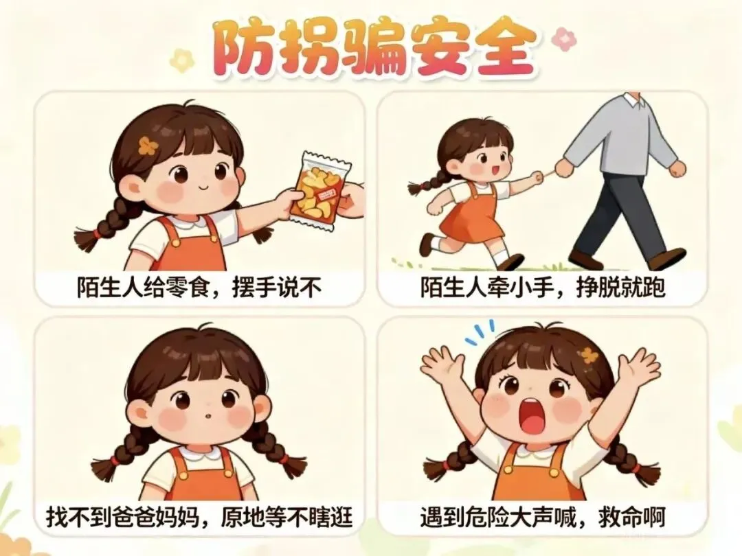 家长们提醒孩子在公共场所,加强自我防范,防止被人拐骗,外出一定要有家长陪同,保管好随身携带的物品,同时还要向孩子介绍一些如何提防陌生人、如何防盗等方面的知识。