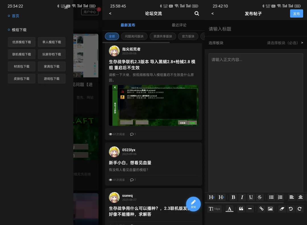 回到首页,点击左上角的三条杠图标,就能看到各类模组分类,还有各种配套资源包——比如游戏本体就放在游戏包中,往下滑动找到标注2.4的版本即可获取,其他资源小伙伴们按需领取就好。右上角的“我的”页面中,有专门的论坛交流板块,这里汇聚了大量玩家的交流帖,顶部还划分了不同板块,可根据自己的需求浏览。要是想分享自己的游戏心得或模组推荐,点击右下角的“发表”按钮,就能轻松撰写并发布文章,配套功能做得十分细致,使用体验很流畅。