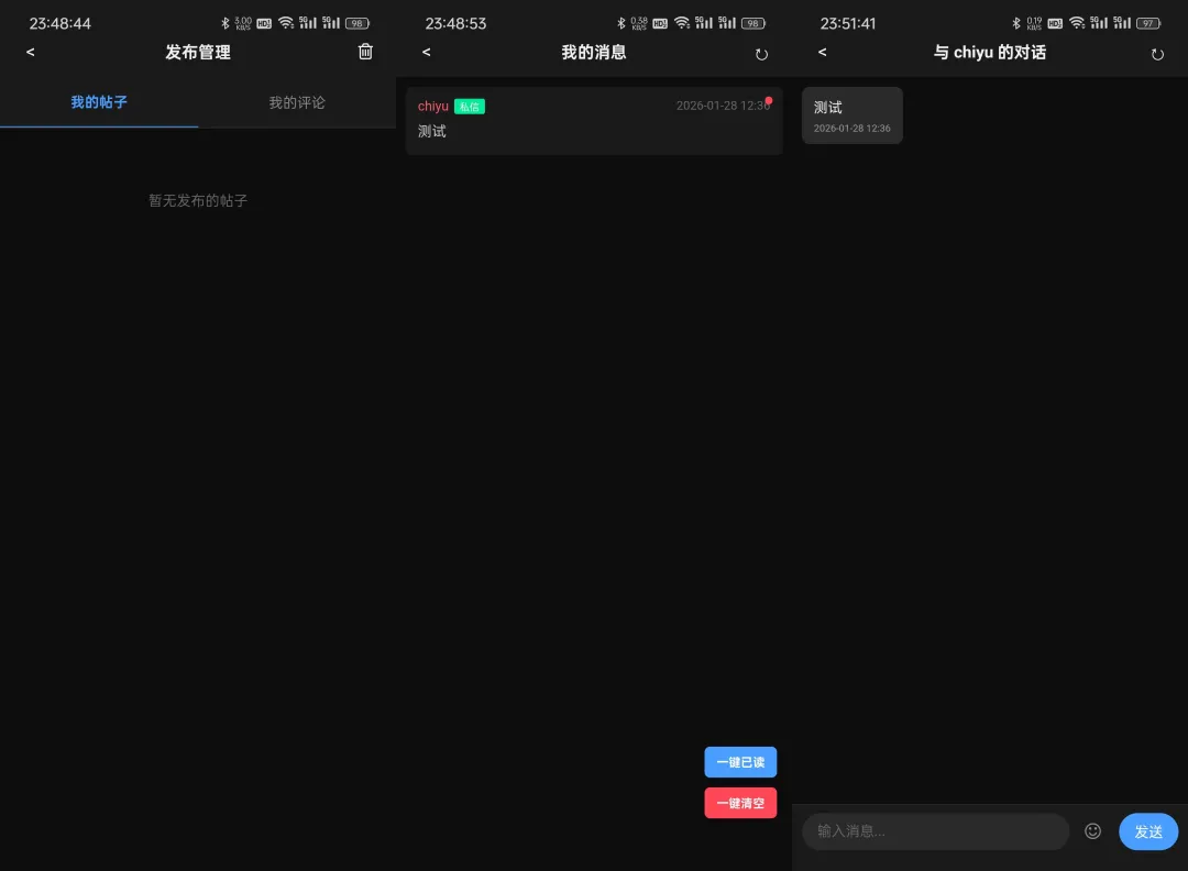 发布后的帖子还支持自主管理,不过由于我目前还没有发布过帖子,这里就不做过多展示啦。另外,前面提到的私信功能也做了专门优化,用来和其他玩家交流完全没有问题,整体操作流畅不卡顿。