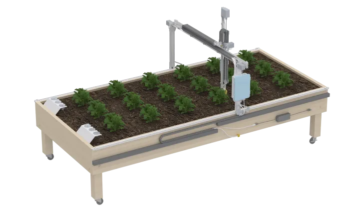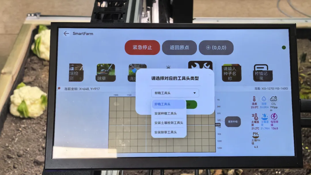 SmartFarm的技术源自数控铣床与3D打印机,搭载X、Y、Z三轴龙门机械臂,配合可替换的工具头(播种器、喷灌头、除草器),实现了从播到管的全程自动化。