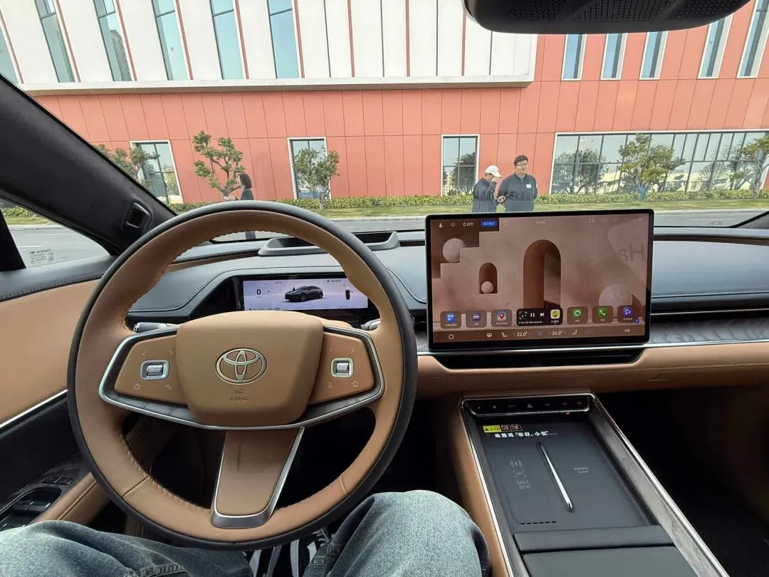 然后.我.拉开车.门,上车。内.饰.这一块我.得多说两句。我现在用指甲敲一下.这.个中.控台,嗯,是软的,不是毛.坯房,这点先给个好评。整体.风格还是丰田那.种偏居家.的味道,但关键是,它上了鸿蒙座舱5.0。我刚才点.了两下,菜单逻辑.非常像手.机,反应也快,不是那种你点了它还在思考人生的状态。语音识别.我试了一.下,普通话、西安话混着说,它也能听懂个.七七八八,这个.确实比之前我体验过的某些合资车好太多了。