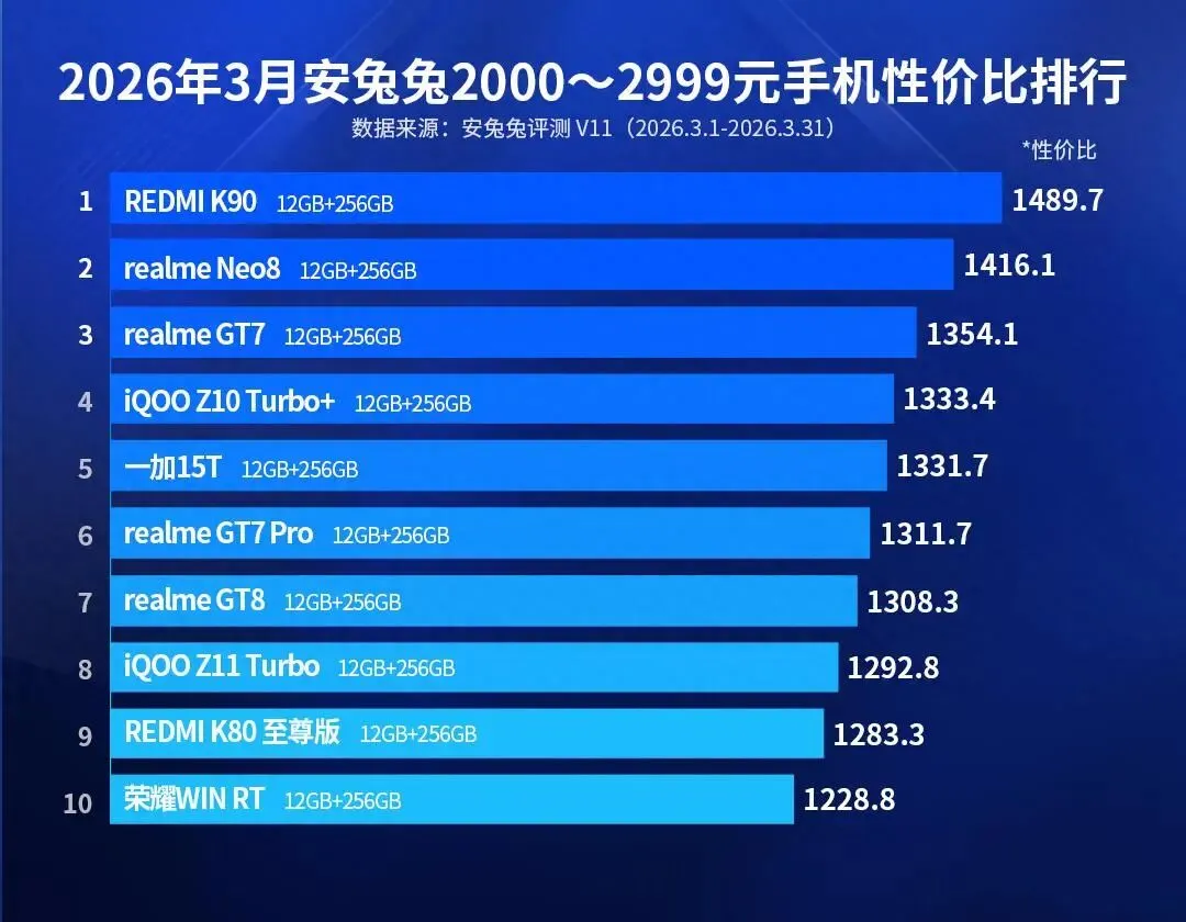今天分享的是2026年3月安兔兔性价比榜单,目标是2000-2999元价位的中端手机,其中红米K80至尊版排名第九,第一名确实在意料之中。今天的这个榜单是有错误的,那就是刚发布的一加15T,该机的售价和国补价分别为4299元和3799元。不过真没那么重要,重要的是分享时的优缺点分析和现在到手价格,这才是小编想要和大家分享的内容。