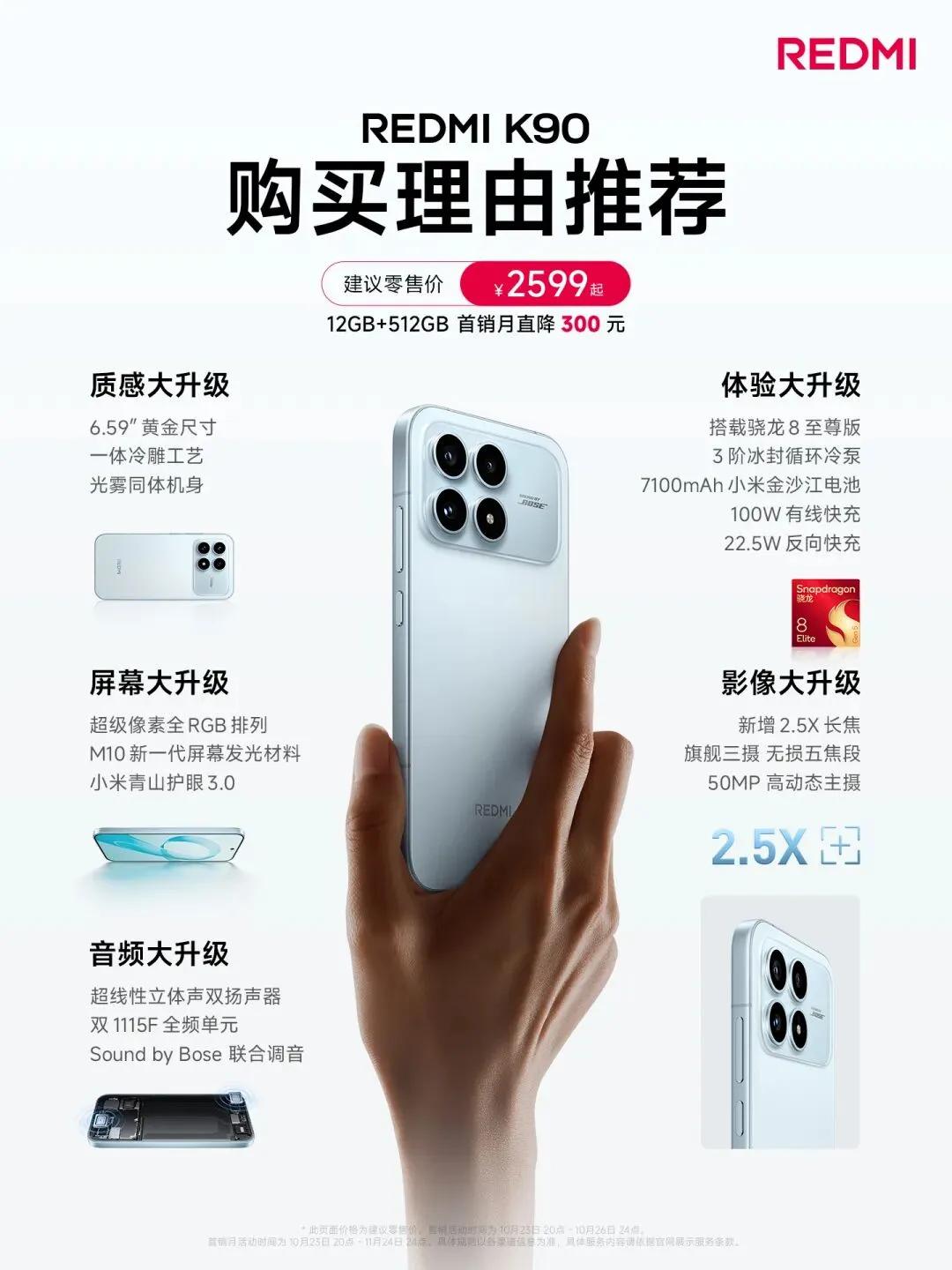 排名第一的是红米K90,12GB+256GB版国补价2070元,是目前最实惠的骁龙8Elite手机。该机采用6.59英寸旗舰直屏,搭配四微曲包裹式中框和一体冷雕工艺后盖,兼顾旗舰质感和握持体验,还有7100毫安时电池和100W闪充。影像方面有光影猎人800旗舰主摄和2.5X黄金人像长焦,内置超线性对称双扬,还有满级防尘防水、超声波指纹识别和小米星辰通信等等,16GB+512GB版2981元。