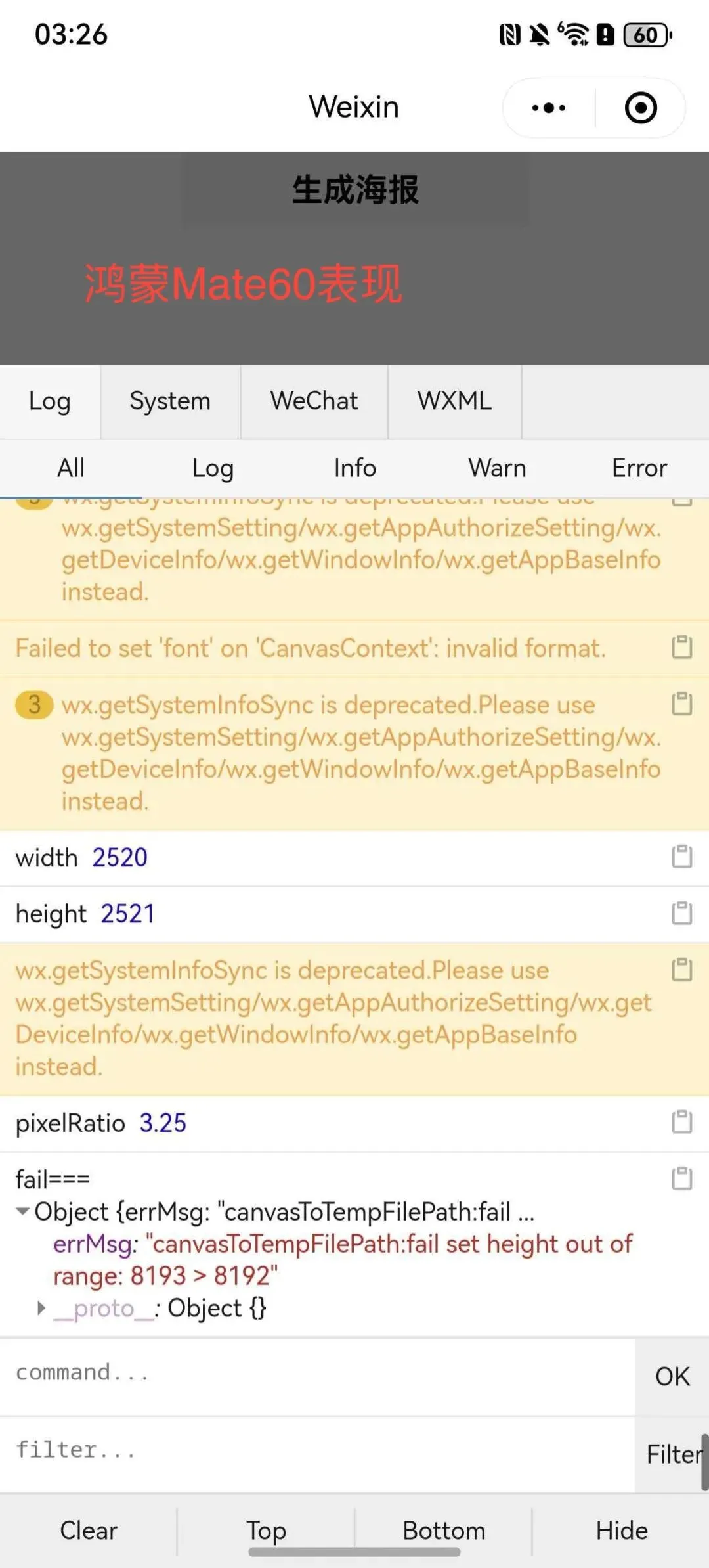 鸿蒙版微信小程序,使用wx.canvasToTempFilePath把当前canvas画布指定区域的内容导出生成指定大小的图片,这个API对于宽高是有限制的,在鸿蒙端不同机型的手机对于宽高的限制不同,超出限制会报错。安卓端的限制远大于鸿蒙端。