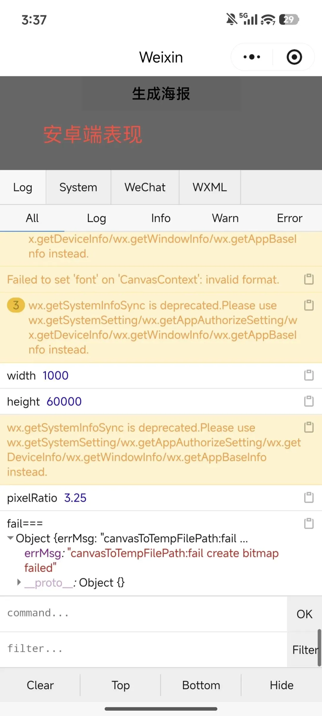 解决方案:建议使用canvas组件绘制图片时,根据wx.getDeviceInfo获取设备的类型进行判断,如果是鸿蒙设备则宽不要超过2520,或者高不要超过4681;安卓设备的高不要超过50000,来控制图片尺寸来暂时规避wx.canvasToTempFilePath保存图片失败的问题。