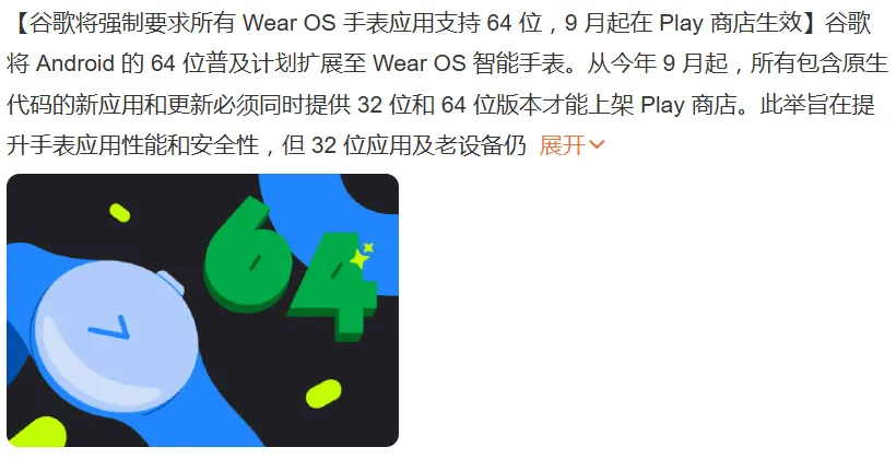 谷歌表示,从今年 9 月开始,所有包含原生代码的 Wear OS 新应用和应用更新在发布到 Play 商店时,必须同时提供 32 位和 64 位版本。如果不符合要求,则无法在 Play Console 中上传新版本。