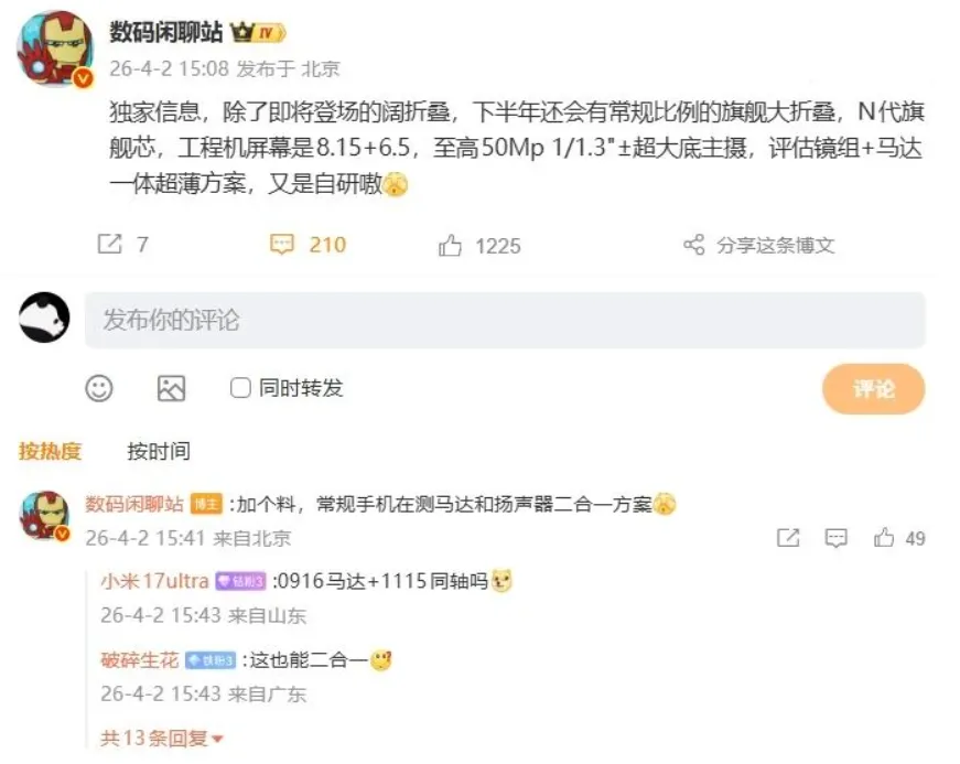 有网友询问:“折叠屏也要上 1.3 超大底主摄了吗?安卓这边也没有上的吧。”博主回复称:“安卓这边上 2 亿。”还有网友对阔直屏新机充满期待,博主表示:“这个也有,品类巨丰富。”