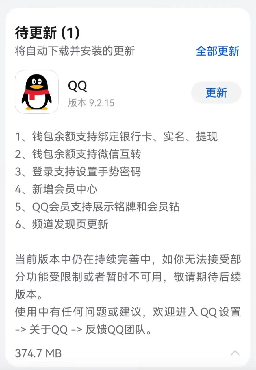 4 月 2 日消息,QQ鸿蒙版 App 今日在华为应用市场(App Gallery)推送了9.2.15 正式版本升级,带来了钱包余额支持微信互转、登录支持设置手势密码等功能。