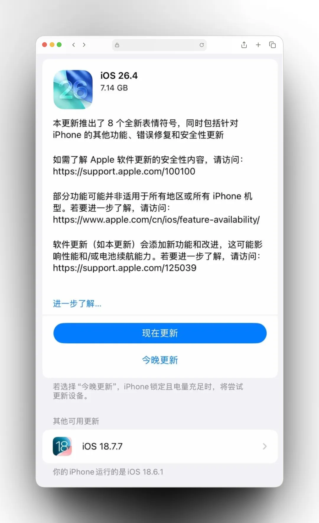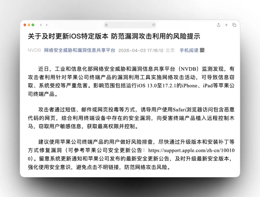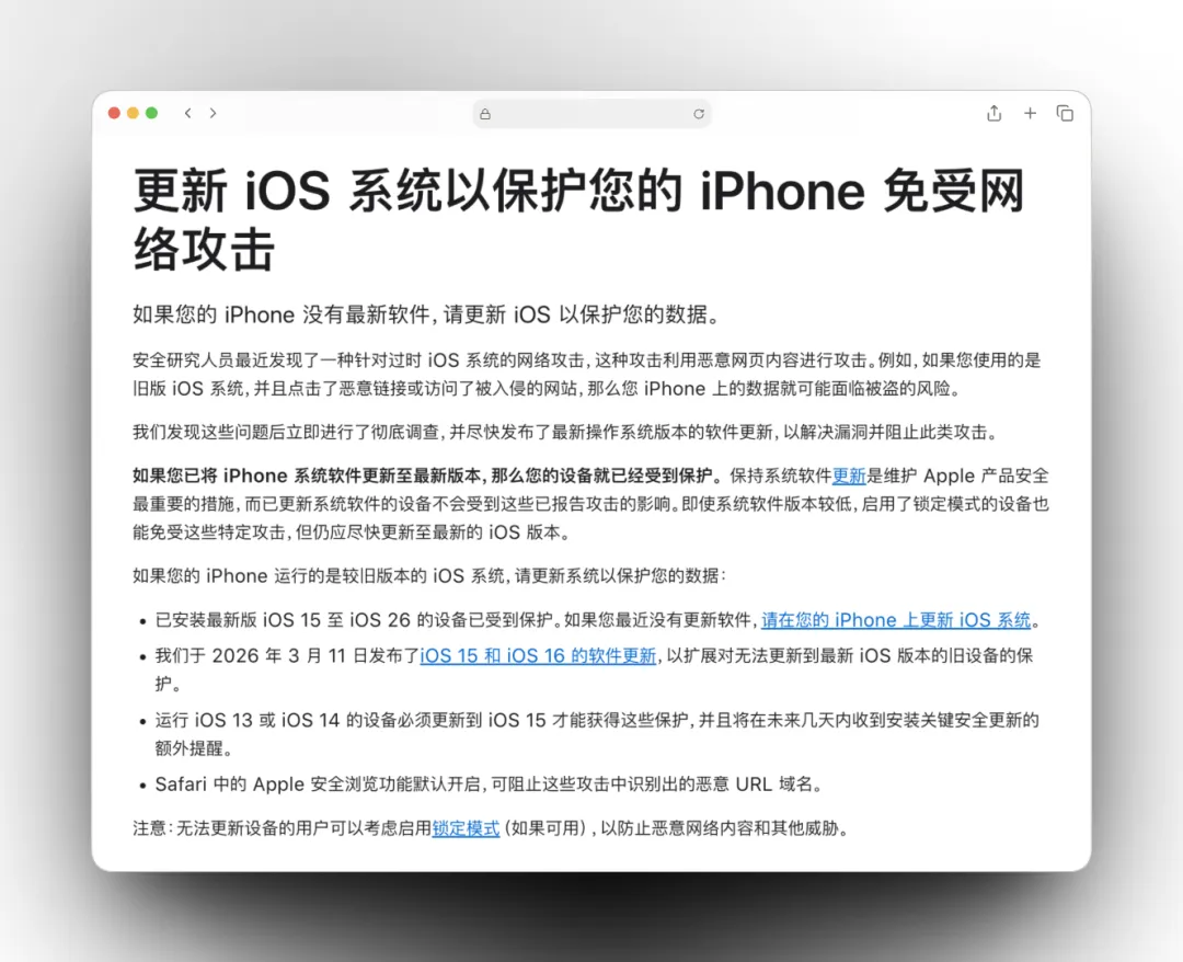 最近几天苹果官网甚至直接 iPhone 内置警告的方式提醒老用户更新 iOS 系统,防止 iPhone 免受网络攻击。不过还是很多人不以为然,觉得没必要升级 iOS 系统。昨天工信部在公众号发文:建议使用苹果公司终端产品的用户做好风险排查,尽快通过升级版本和安装补丁等方式修复漏洞。文章中表示:攻击者通过短信、邮件或网页投毒等方式,诱导用户使用Safari浏览器访问包含恶意代码的网页,综合利用终端设备中存在的安全漏洞,向受害终端产品植入远程控制木马,窃取用户敏感信息,获取最高权限并控制。也就是说这个安全漏洞,很可能是你直接点击了一个不知名链接就触发了。受影响的设备包括从 iOS 13 到 iOS 18。由于事态紧急,苹果采取了多种方式提示用户赶紧升级:比如一些能升级 iOS 26 的旧版本系统,苹果这次给他们推送了专属的安全补丁。即便不升级 iOS 26 也能修复漏洞。再比如针对老用户的系统层级的警告通知,同样的 iOS 15/16 等系统也有专属的安全补丁。如果你的 iPhone 是主力机,并且不是当前 iOS 系统的最新版本,那么我还是建议大家尽快升级。并不是一定要升级 iOS 26,而是当前 iOS 系统的最新版。苹果官方 + 工信部都提出了警告,这次并非小小的隐私漏洞这么简单。毕竟随便点击一个不知名的链接,就有可能窃取你的资料。