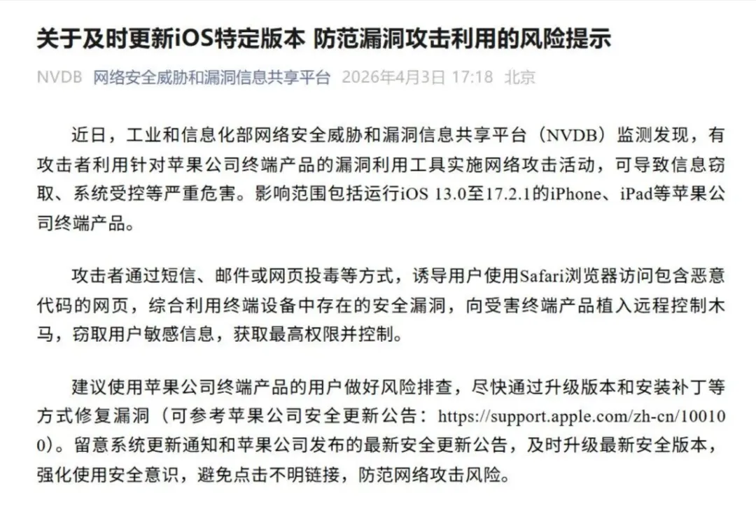 5、工信部昨日发文提醒,iOS 13.0 至 iOS 17.2.1 存在安全漏洞,易遭受网络攻击。建议使用上述 iOS 版本的用户尽快升级系统。