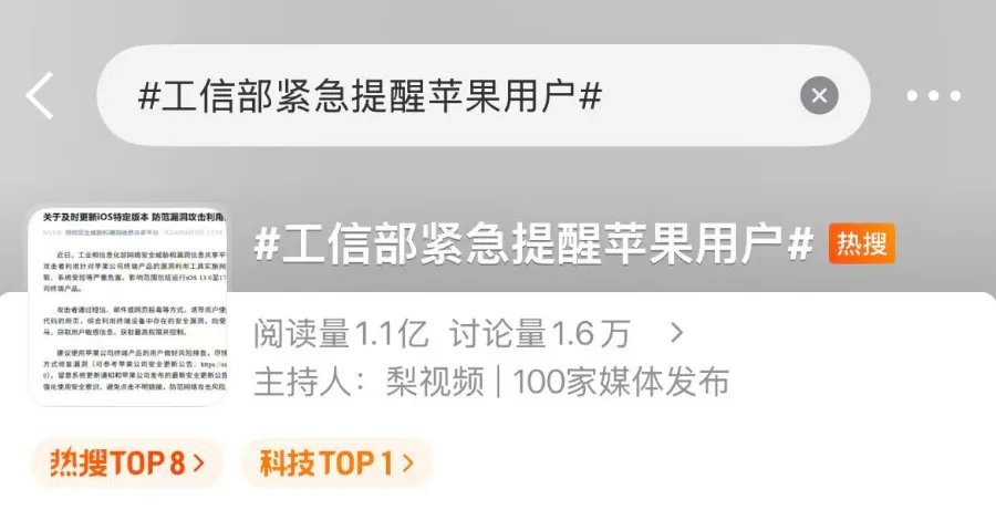 昨晚一天热搜直登微博科技板块的TOP1:工信部紧急提醒苹果用户!