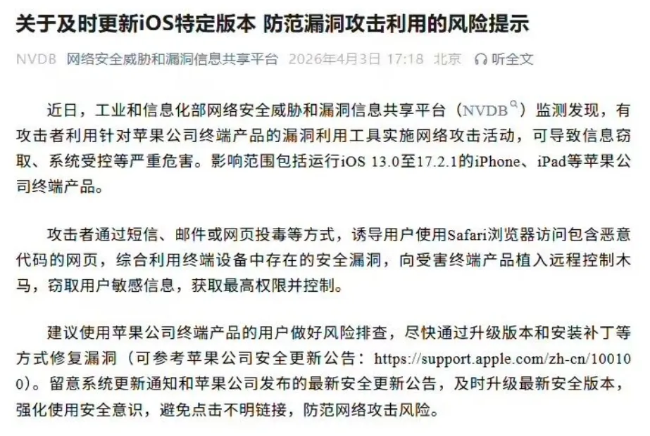 这条风险提示是针对于iOS 13.0 至 iOS 17.2.1的系统用户,如果已经更新到了最新的版本,则无需紧张。
