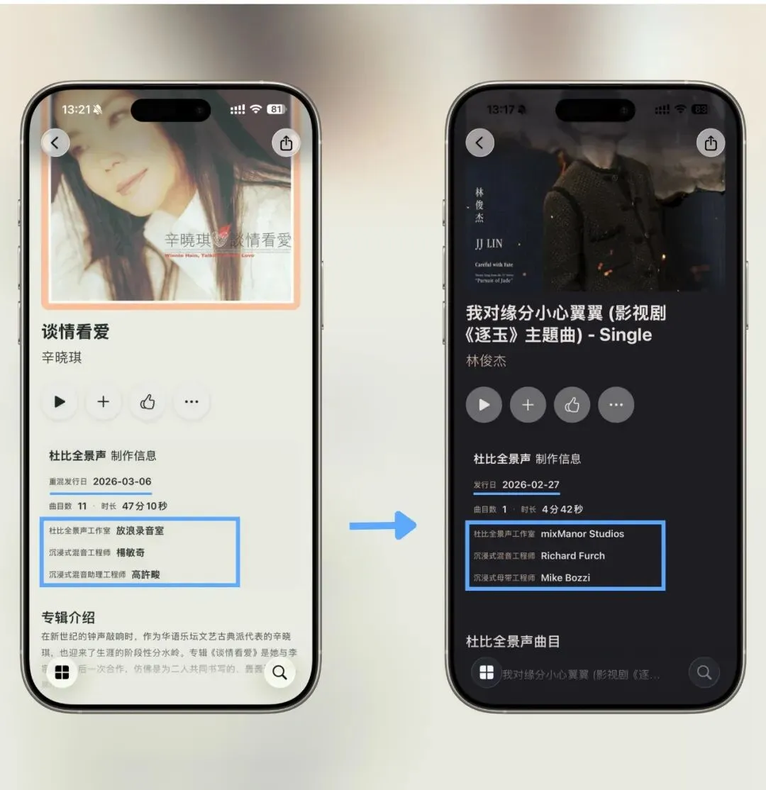 另外,在发行日维度上,全景声重混专辑的标签会显示为“重混发行日”,同步上架的全景声专辑将其显示为“发行日”。