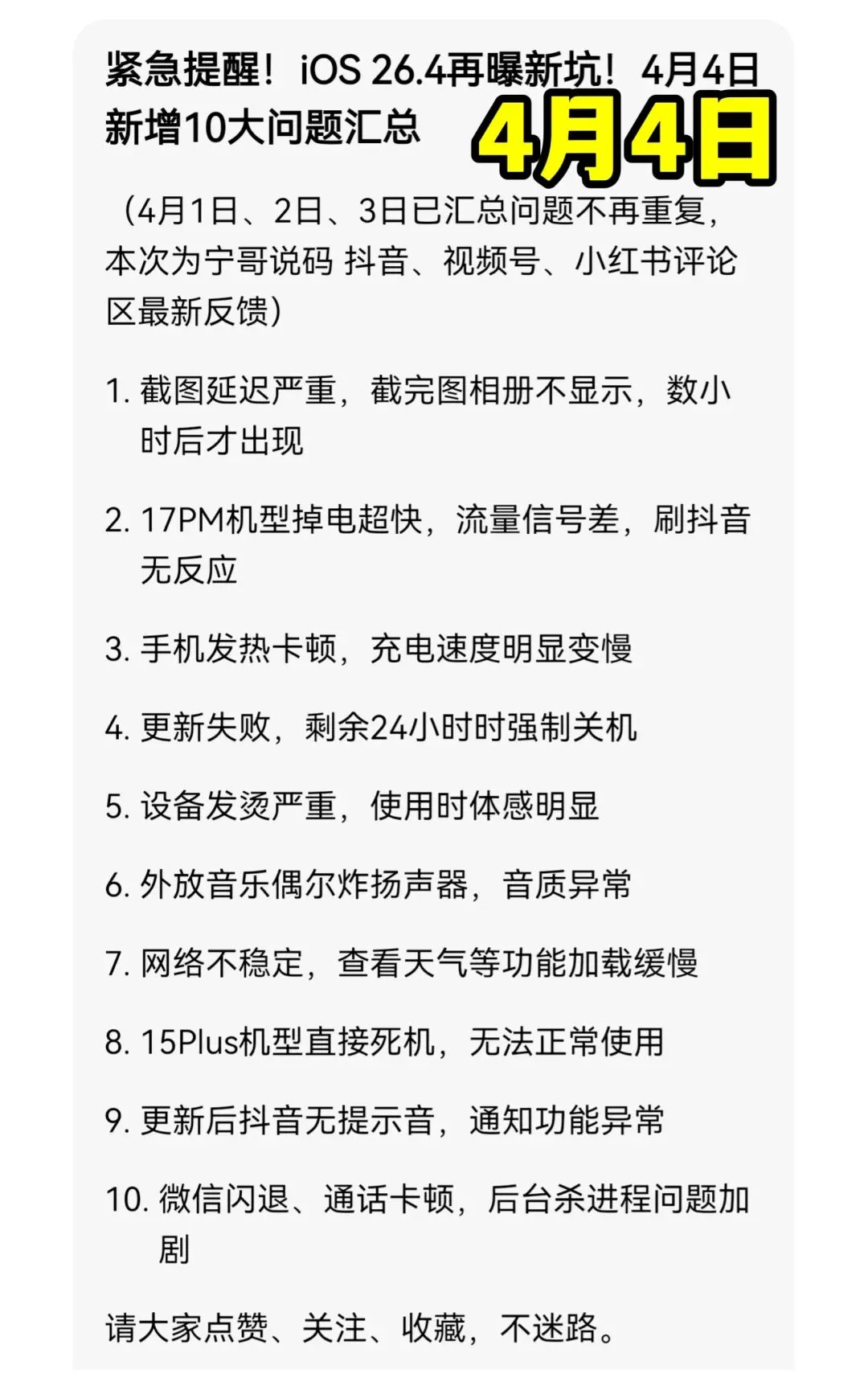 二、iOS 26.4 已经出现的问题(来自大量用户实测)