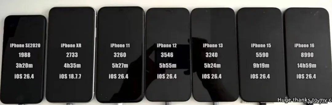 苹果这次推送iOS26.4很安静,系统包就这么到了,打开一看没什么大动作的宣传,电量这块倒是动了不少机型,iAppleBytes做了整套实测,放出对比之后差异一下子就看出来了,平时盯着续航的人一眼就能抓重点。
