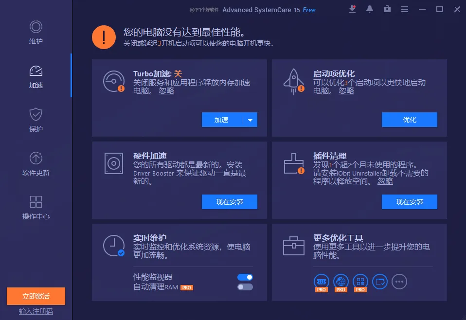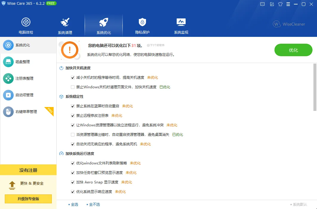 不过 Wise Care 365 不是完全免费的,部分功能需要 Pro 版,当然如果你只需要用来系统优化、垃圾清理,免费版够用了。