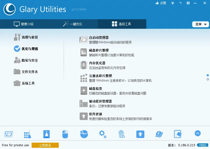 同样 Glary Utilities 不完全免费,有付费的 Pro 版,里面一部分小工具需要 Pro 版才能用,不过系统优化功能基本上无限制。