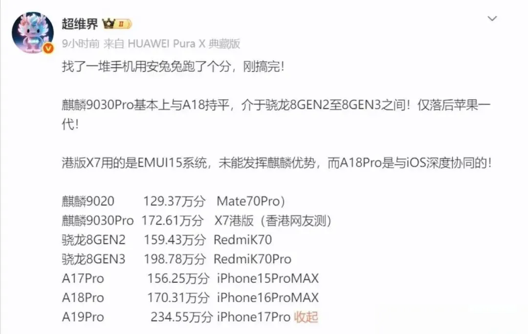 更关键的是,这次跑分的测试机是港版Mate X7,运行的是基于安卓底层的EMUI 15系统,完全没有启用纯血鸿蒙的底层优化。也就是说,这172万分只是麒麟9030 Pro的“基础版”性能,一旦搭配纯血鸿蒙的软硬协同,性能上限还有很大的提升空间。