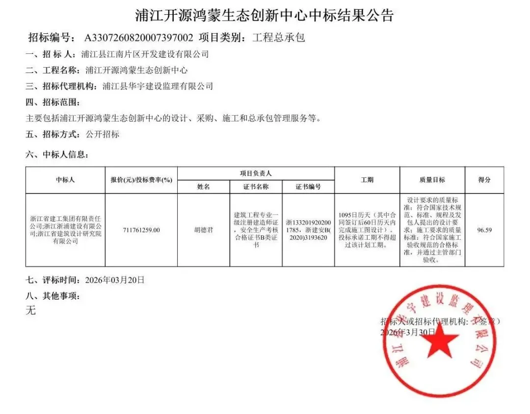 2026年3月30日,浦江开源鸿蒙生态创新中心项目EPC工程总承包中标结果正式公告。由浙江省建工集团有限责任公司(牵头人)、浙江浙浦建设有限公司、浙江省建筑设计研究院有限公司组成的联合体,以71176.1259万元的投标报价成功中标。
