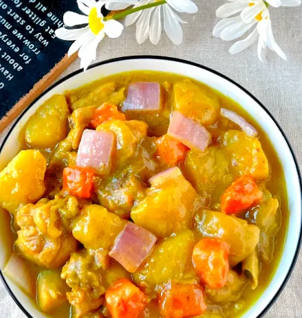 咖喱土豆焖鲜鸡、肉丝炒莴笋、小米饭
