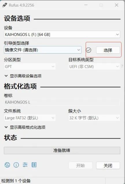 2,点击“选择”,从本地选择 KaihongOS 镜像文件,如下图所示;