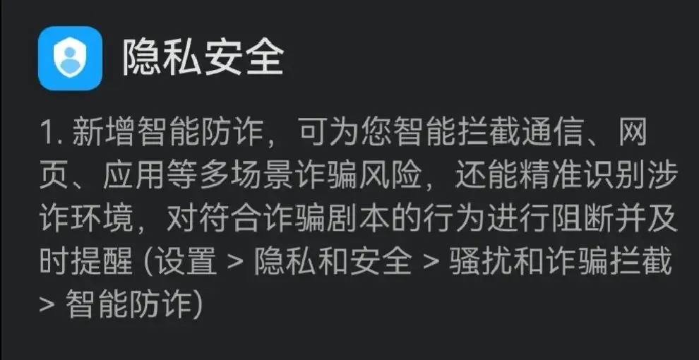 新增智能防诈功能,通话、短信、网页、应用多场景主动识别风险;预警可疑来电、涉诈网站、异常应用行为;优化权限管理,每一次授权更清晰,每一次访问可控可查