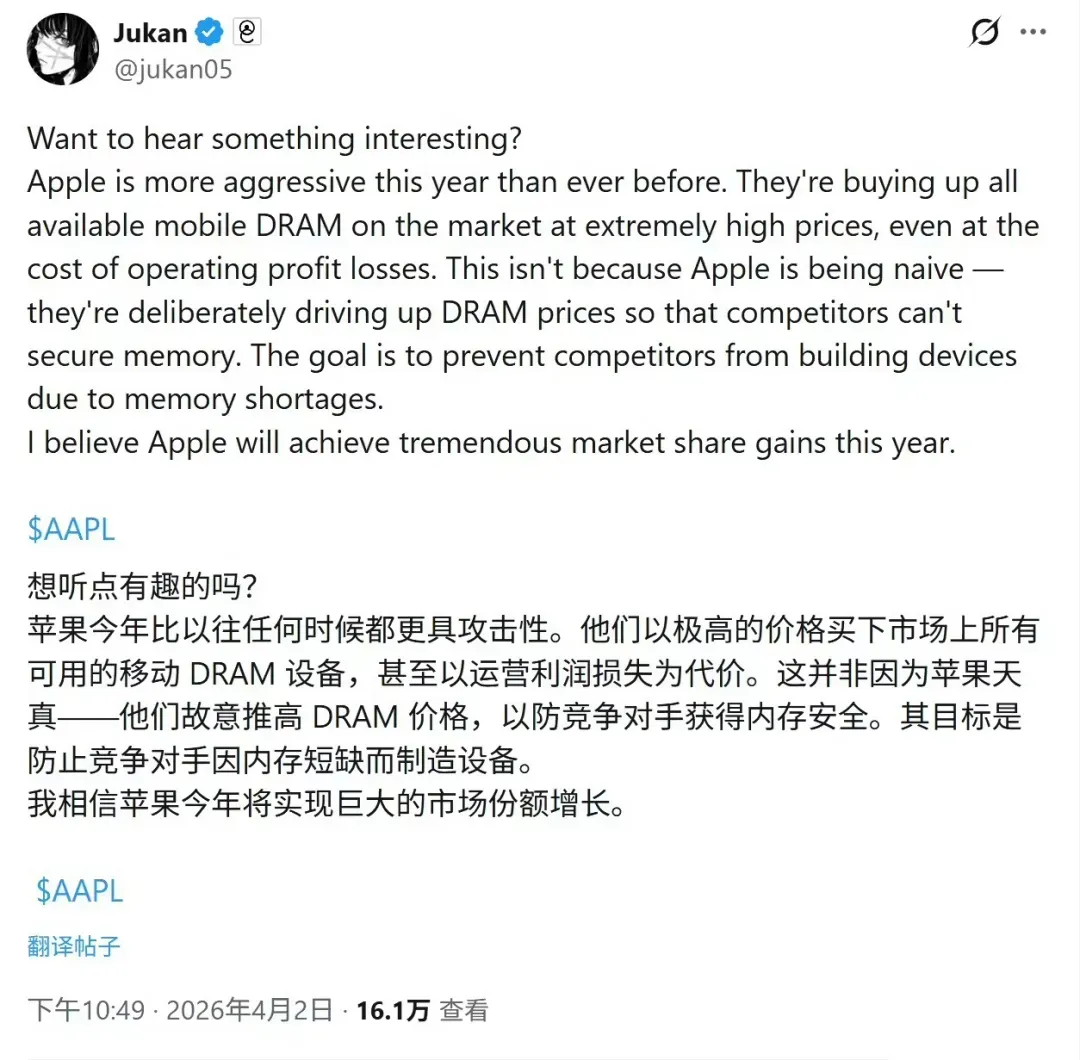 第三层:时间差打击。 苹果通常在 9 月发布新机,Q2-Q3 是内存采购高峰期。现在扫货,直接卡住了安卓厂商下半年的备货节奏。等安卓反应过来,颗粒早就进了苹果的仓库。