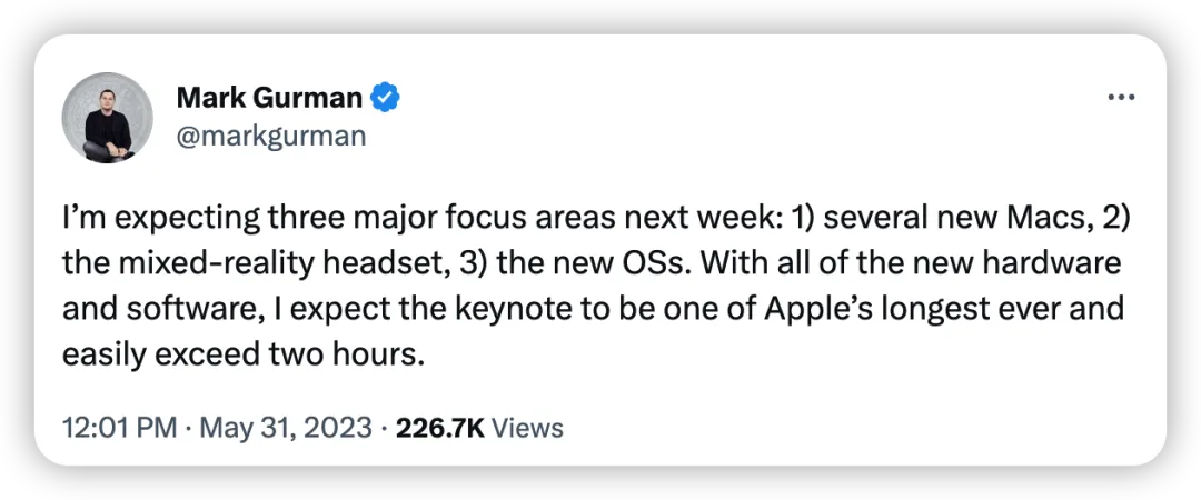 根据此前外界传出的消息,苹果已经为首款 AR 设备开发了全新的 xrOS 系统。不出意外的话,苹果将会在主题演讲中带来 AR 设备和 xrOS 系统的功能演示,并在之后邀请开发者加入,共同构建全新的软件生态。按照 Mark Gurman 的说法,要装下如此多的内容,本届 WWDC 主题演讲的时长很容易超过 2 个小时。如果消息属实,今年的 WWDC 或将成为有史以来最长的 WWDC 主题演讲之一。总之,距离正式开幕也仅剩不到一周,让我们一起期待吧。