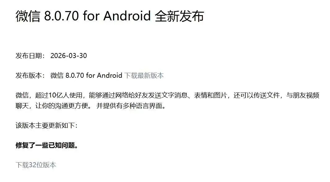 4 月 2 日最新消息,微信安卓 8.0.70 正式版已正式推送,本次更新带来了多项细节功能:用户给自己发送的消息支持撤回。同时,聊天界面中的新消息通知设置支持覆盖所有机型。