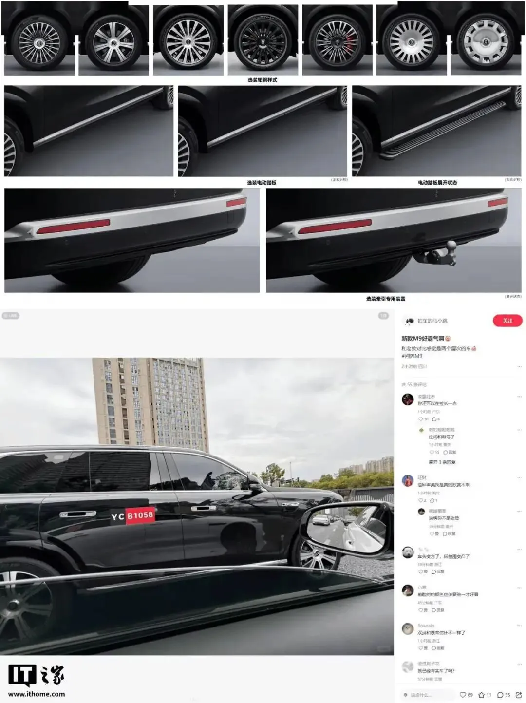 申报信息显示,新车提供了丰富的选装配置,以满足用户的个性化需求。轮毂选择尤为多样,既有强调运动属性的黑化多辐条设计,也有主打极致豪华的“大饼”造型轮圈,后者风格与顶级豪华轿车相似,显著提升了整车的气场。此外,电动踏板和车尾拖钩也在选装清单之列。