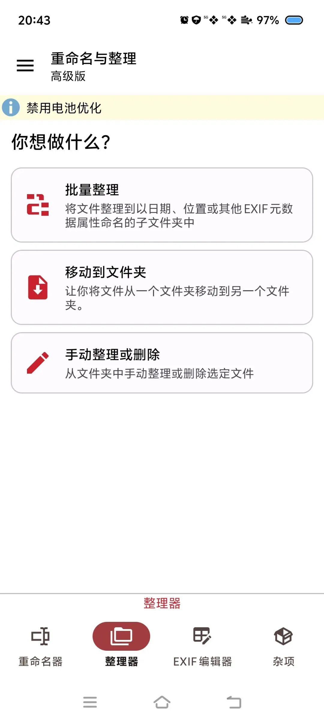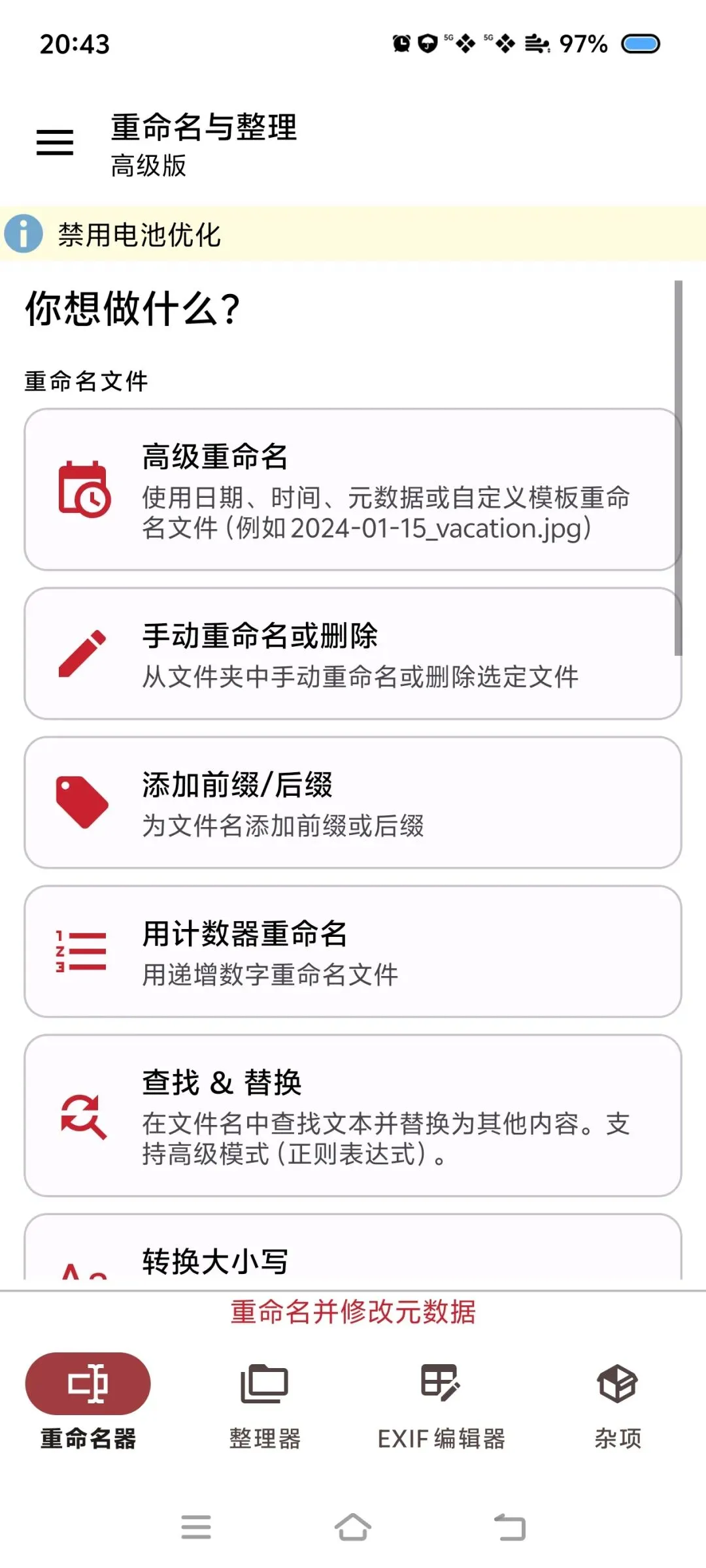 今天推荐的软件是:重命名与整理,手机文件管理工具,让你的文件从此不再杂乱无序,易于查找。软件支持安卓系统,纯净无广告,功能简洁实用,更多请参看截图。