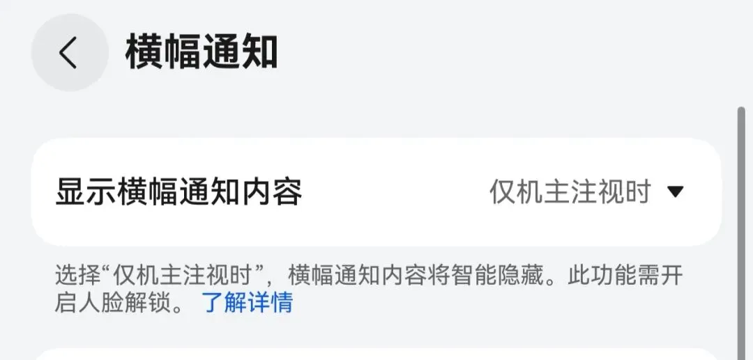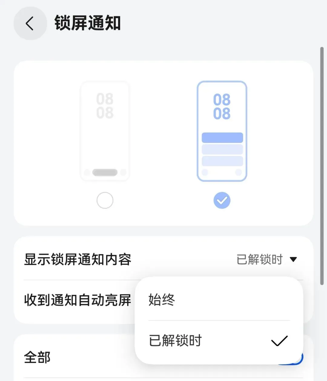 但问题又来了,尽管微信里“通知显示内容”选了“仅显示你收到了1条消息”,但锁屏界面上始终显示完整的发信人和消息内容。继续研究,做了以下设置,终于既能通知新消息,又不在锁屏时显示完整消息了。