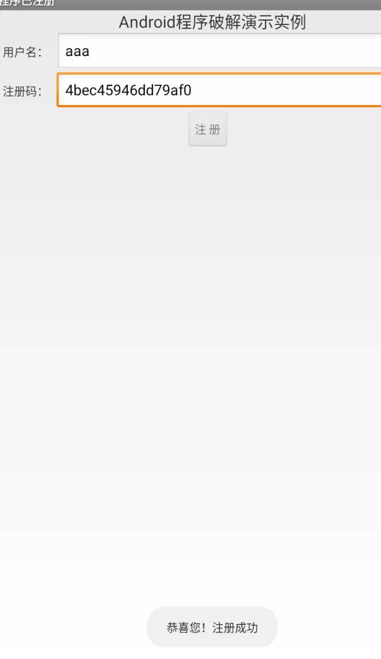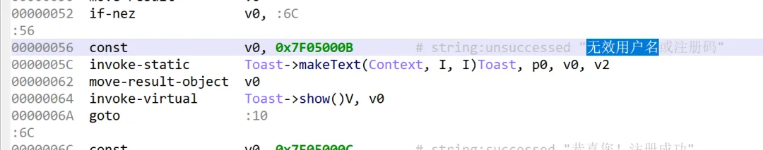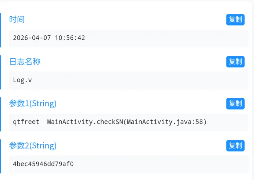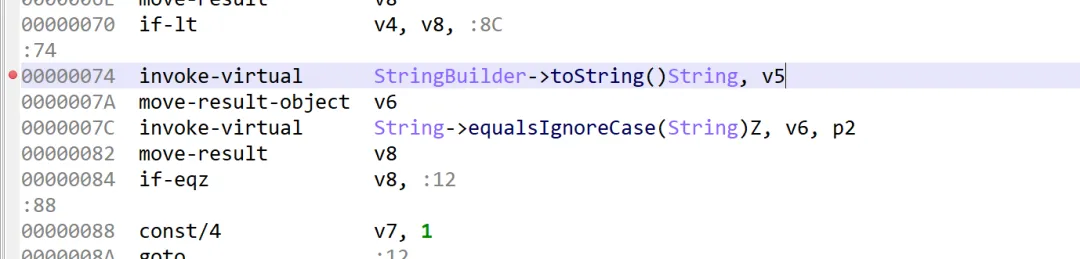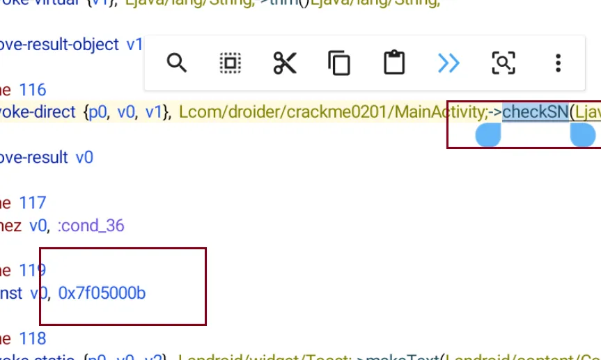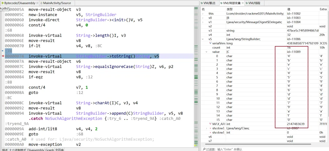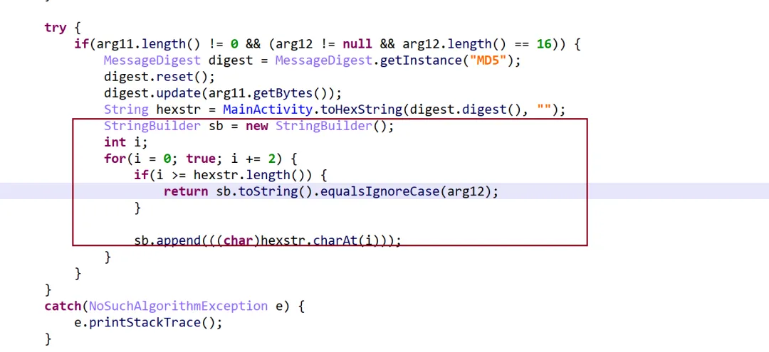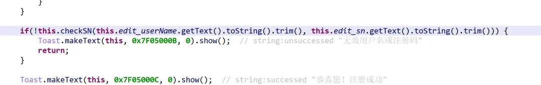 可以看到这里调用了checkSN方法,猜测此处为注册码的校验函数,双击进行跳转查看/** * 序列号(SN)校验核心方法 * 逻辑:对 arg11 做 MD5 加密 → 取 MD5 字符串的偶数下标字符 → 拼接成 16 位字符串 → 和 arg12 比对 * @param arg11 待加密的原始字符串(如设备号、密钥) * @param arg12 待校验的 16 位 SN 码 * @return 校验通过返回 true,失败/异常返回 false */private boolean checkSN(String arg11, String arg12) { // 如果第一个参数 arg11 为 null,直接校验失败,返回 false if(arg11 == null) { return false; } try { // 进入核心校验的条件: // 1. arg11 不是空字符串 // 2. arg12 不为 null // 3. arg12 长度必须严格等于 16 位 if(arg11.length() != 0 && (arg12 != null && arg12.length() == 16)) { // 获取 MD5 消息摘要对象(用于计算 MD5 哈希值) MessageDigest digest = MessageDigest.getInstance("MD5"); // 重置摘要对象状态(冗余代码,new 出来默认就是清空状态) digest.reset(); // 将 arg11 字符串转为字节数组,更新到 MD5 计算器中 digest.update(arg11.getBytes()); // 计算最终 MD5 哈希值,并调用工具类转为十六进制字符串(标准 32 位) String hexstr = MainActivity.toHexString(digest.digest(), ""); // 创建字符串构建器,用于拼接提取出来的字符 StringBuilder sb = new StringBuilder(); // 定义循环变量 i int i; // 死循环:i 从 0 开始,每次 +2(只取偶数下标:0、2、4、6...) for(i = 0; true; i += 2) { // 当 i 超过 MD5 字符串长度时,结束循环并返回比对结果 if(i >= hexstr.length()) { // 将拼接好的字符串与 arg12 忽略大小写比对,返回比对结果(true/false) return sb.toString().equalsIgnoreCase(arg12); } // 取出 MD5 字符串中 偶数下标 i 位置的字符,追加到 StringBuilder 中 sb.append(((char)hexstr.charAt(i))); } } } // 捕获异常:系统不支持 MD5 算法时触发(理论上几乎不会发生) catch(NoSuchAlgorithmException e) { // 打印异常堆栈信息(用于调试) e.printStackTrace(); } // 不满足核心校验条件 或 发生异常,最终返回 false return false;}