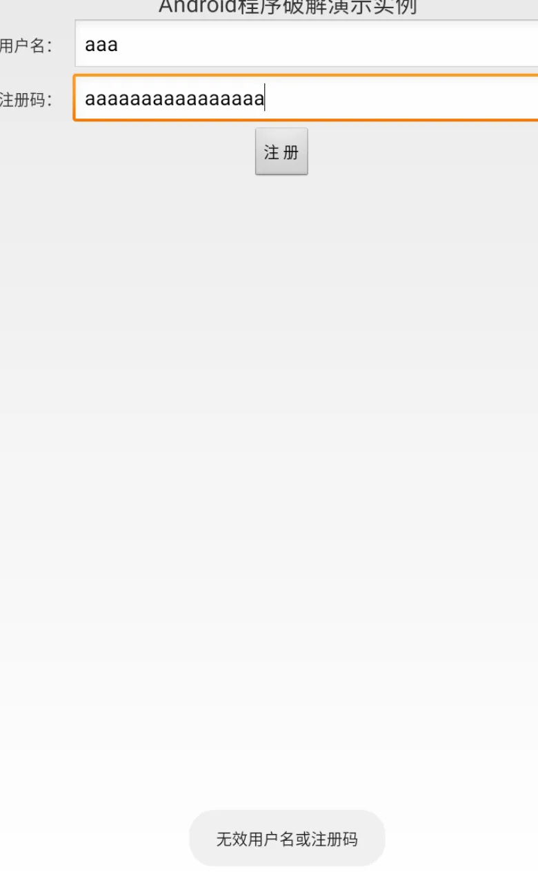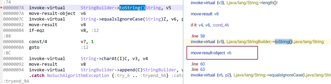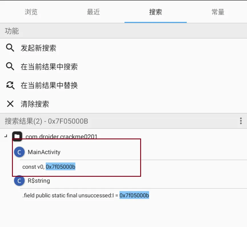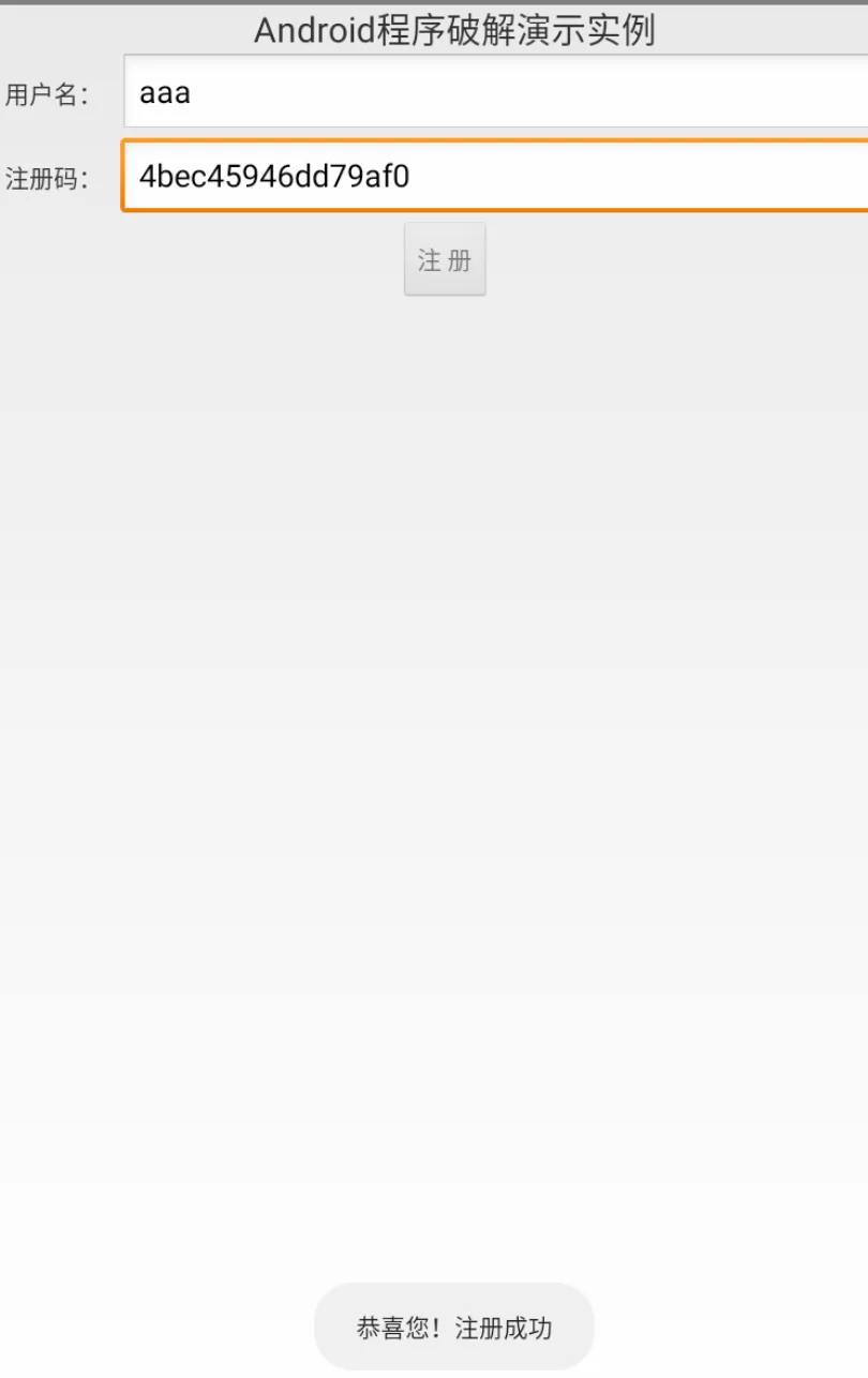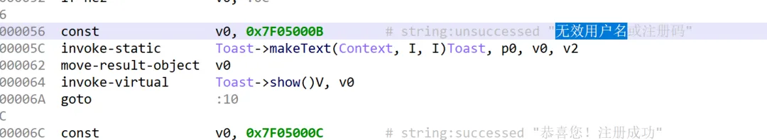 可以看到这里调用了checkSN方法,猜测此处为注册码的校验函数,双击进行跳转查看/** * 序列号(SN)校验核心方法 * 逻辑:对 arg11 做 MD5 加密 → 取 MD5 字符串的偶数下标字符 → 拼接成 16 位字符串 → 和 arg12 比对 * @param arg11 待加密的原始字符串(如设备号、密钥) * @param arg12 待校验的 16 位 SN 码 * @return 校验通过返回 true,失败/异常返回 false */private boolean checkSN(String arg11, String arg12) { // 如果第一个参数 arg11 为 null,直接校验失败,返回 false if(arg11 == null) { return false; } try { // 进入核心校验的条件: // 1. arg11 不是空字符串 // 2. arg12 不为 null // 3. arg12 长度必须严格等于 16 位 if(arg11.length() != 0 && (arg12 != null && arg12.length() == 16)) { // 获取 MD5 消息摘要对象(用于计算 MD5 哈希值) MessageDigest digest = MessageDigest.getInstance("MD5"); // 重置摘要对象状态(冗余代码,new 出来默认就是清空状态) digest.reset(); // 将 arg11 字符串转为字节数组,更新到 MD5 计算器中 digest.update(arg11.getBytes()); // 计算最终 MD5 哈希值,并调用工具类转为十六进制字符串(标准 32 位) String hexstr = MainActivity.toHexString(digest.digest(), ""); // 创建字符串构建器,用于拼接提取出来的字符 StringBuilder sb = new StringBuilder(); // 定义循环变量 i int i; // 死循环:i 从 0 开始,每次 +2(只取偶数下标:0、2、4、6...) for(i = 0; true; i += 2) { // 当 i 超过 MD5 字符串长度时,结束循环并返回比对结果 if(i >= hexstr.length()) { // 将拼接好的字符串与 arg12 忽略大小写比对,返回比对结果(true/false) return sb.toString().equalsIgnoreCase(arg12); } // 取出 MD5 字符串中 偶数下标 i 位置的字符,追加到 StringBuilder 中 sb.append(((char)hexstr.charAt(i))); } } } // 捕获异常:系统不支持 MD5 算法时触发(理论上几乎不会发生) catch(NoSuchAlgorithmException e) { // 打印异常堆栈信息(用于调试) e.printStackTrace(); } // 不满足核心校验条件 或 发生异常,最终返回 false return false;}