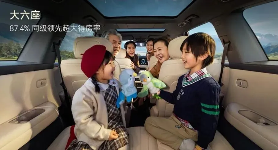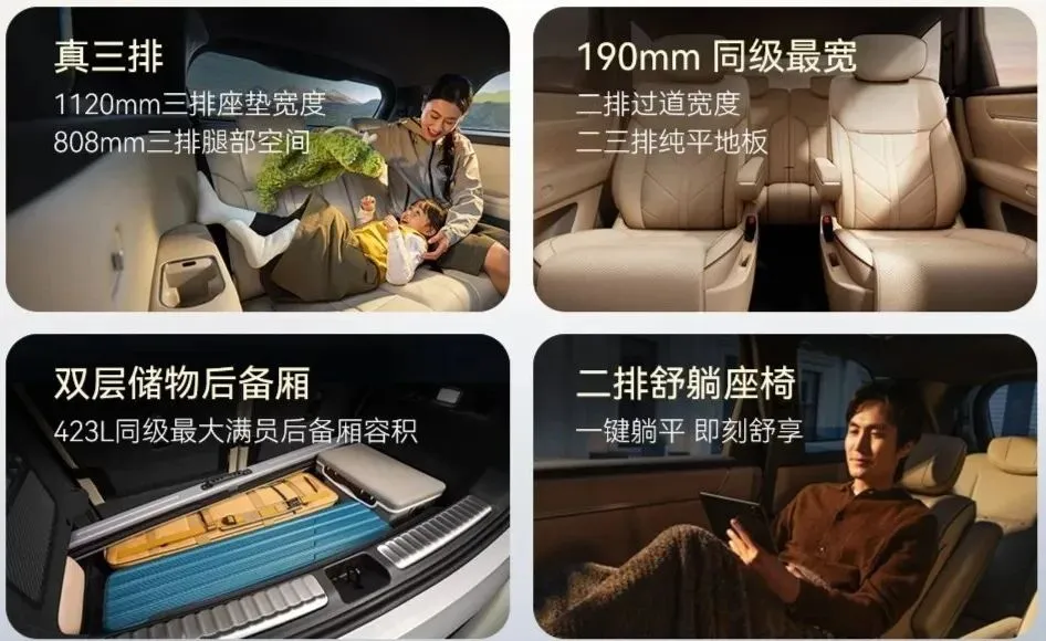 车内配置包括28处储物格、6座独立充电口、纯平地板设计、中排进出辅助拉手、后排吸顶娱乐屏、双小桌板、车载冷暖冰箱、智能香氛,以及燕飞利仕音响与哈曼3D环绕声系统。