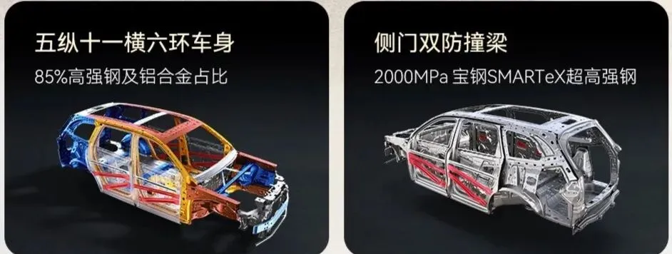 被动安全配置方面,华境S采用由奥托立夫、延锋提供的9气囊14腔体全方位防护矩阵,贯穿式侧气帘三排全覆盖,具备6秒超长保压时间,还有双腔设计的远端气囊。车身方面,高强度钢及铝合金占比超过85%,四门配备2000MPa潜艇级防撞梁,构建五纵十一横六环笼式车身结构。