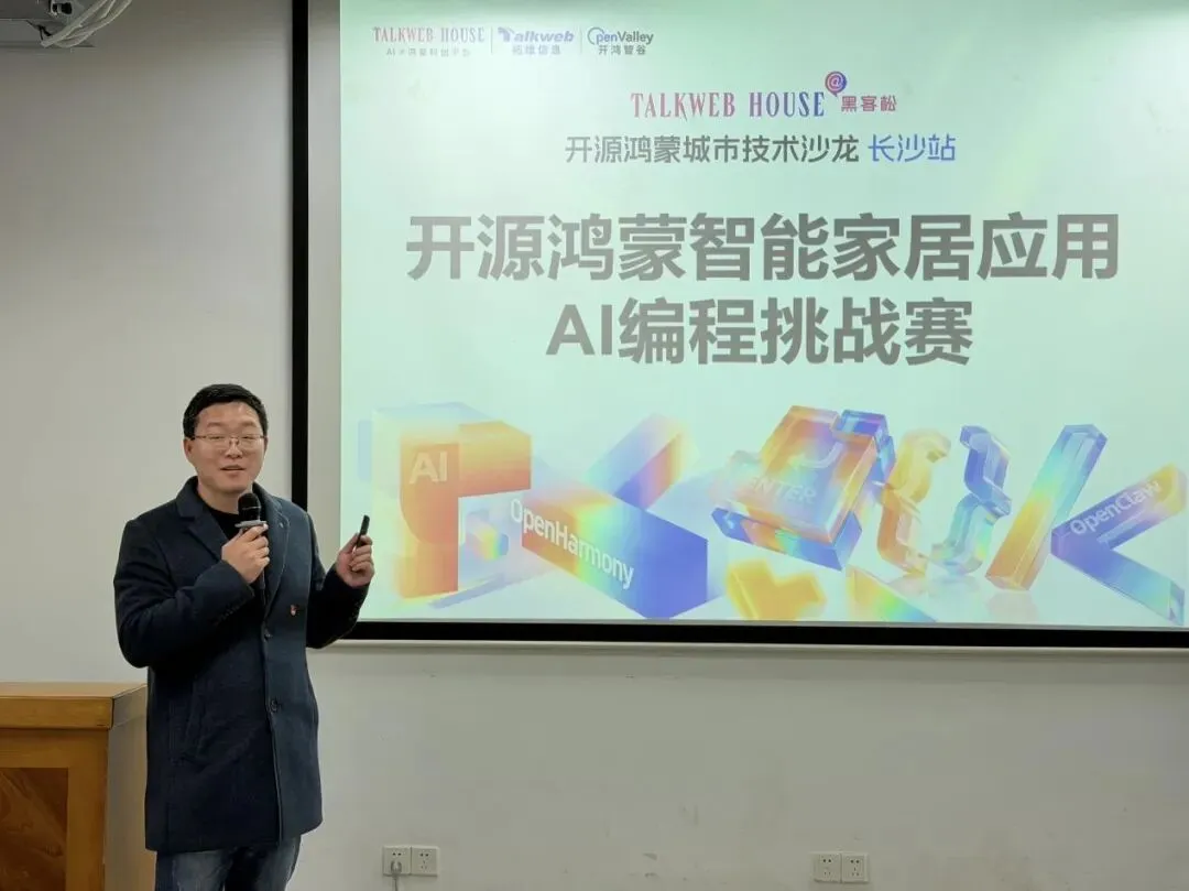 作为Talkweb House黑客松暨开源鸿蒙城市技术沙龙2026年首站活动,现场既有前沿技术的思想交锋,更有硬核实战的能力淬炼。开鸿智谷应用开发负责人艾彬正式发布了本次黑客松AI 编程挑战赛“基于开源鸿蒙的智能家居控制应用开发”的挑战主题和具体实践任务,要求参赛者在有限时间内,构思并实现一个智能家居场景的AI增强型应用原型,鼓励使用大模型等AI辅助工具提升开发效率、增强应用智能。
