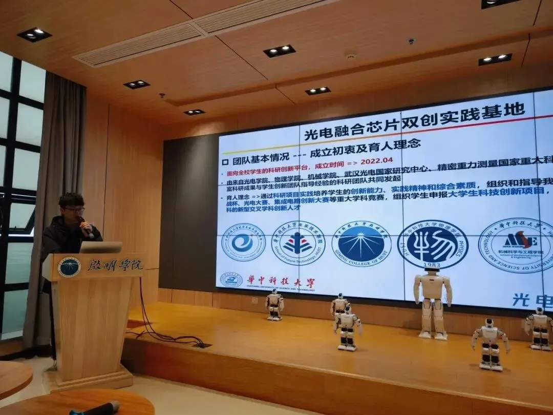 华中科技大学光电融合双创实践基地学生负责人王继鹏同学进行了详实的团队介绍和精彩的竞赛分享。他首先详细介绍了光电融合双创基地团队的基本情况,使得参会者对光电融合双创基地有了全面的了解,感受到基地在人才培养和创新实践方面的丰硕成果。接下来,他分享了前基地学生负责人胡澳在参加国际自主智能机器人大赛中的成功经验。他详细介绍了所使用的机器人平台、各项任务的过关案例、培训的进程和任务的安排,以及往届比赛中的风采展示。这些分享不仅展示了团队在机器人技术领域的实力和创新能力,也为其他同学提供了宝贵的经验和启示。王继鹏同学的分享不仅展示了光电融合双创基地的卓越成果,还激励了在场的每一位师生,鼓励大家积极参与到光电融合芯片的科学研究和创新创业活动中来,共同推动技术的发展与应用。