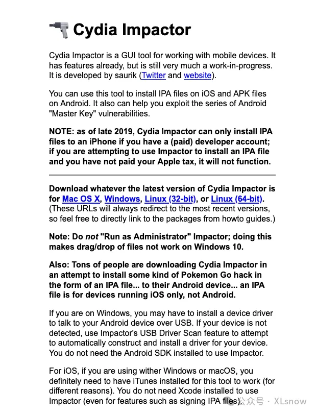 Sideloadly功能-1 无需越狱!Sideloadly专为非越狱设备而设计-2 能够使用免费或付费的帐户对应用程序进行侧加载-3 能够保存您的凭据,以便轻松快速地进行侧加载-4 支持iOS7到iOS18.3+任何设备-5 Wi-Fi无线安装应用程序,无需通过USB连接您的设备!-6 自动应用程序刷新。将自动刷新您的应用程序,以防止过期如果你是老玩家的话, 就听说过Cydia Impactor, 所以Sideloadly就是替代工具, 相当于Cydia Impactor 2.0目前支持最新的系统, 支持证书和普通账号签名安装IPA, 还能注入dylib和framework, 不需要越狱, 任何系统手机都支持的, 比爱思助手强太多了, 爱思只能签名不能改配置哦, 要玩机的话这个必须是要弄明白的! 唯一的不足是英文界面, 这点可以拍照或者截图翻译一下, 很简单的东西, 不需要太多时间的官网下载: https://sideloadly.io/1. 我这边是下载的Mac版本, 下载后打开拖进去就安装完成了, Win端是支持64位和32位 2个版本, 而且最低是Windows7 , 门槛低, Altstore则需要Windows10起步, 很多人低配电脑都不能安装的解决方法: 找到app, 鼠标右键选打开就可以正常打开了3. 把手机连接到电脑后, 信任一下, 就会出现识别了, 然后可以把ipa直接拖到这个界面就能导入了, 或者点击左上角"IPA"那, 就会出行选择框, 你选择本地电脑的ipa文件即可, 4. 在Apple ID下面的输入框输入你的账号, 点击安装的时候会提示你输入密码, 密码验证正确之后就开始安装了, 第二次安装的时候就不需要再次输入密码了, 很方便的, 点击Start就是开始安装了, 一般会提示你密码错误什么的, 你自己要确定密码是否正确, 还有开启二次验证的话, 需要去苹果后台申请一个应用密码来登录, 提示最大数目的话, 就需要更换账号来安装了, 普通账号安装有限制的!5. 打开手机主屏幕上的APP, 注意: 需要进入设置信任该APP和iOS16+开启开发者模式