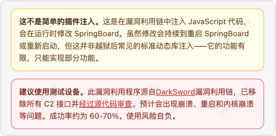 可以通过降频来实现提升续航,但是性能会下降,还可以选择性能级别移植 TrollSpeed 代码实现,可以悬浮显示网速的上行和下行,但目前是实验性功能,网页工具里更新后又下架了,等后续稳定点上线了可以去试试这并不是简单的插件注入修改,而是漏洞利用链中注入 JavaScript 代码,会在运行时修改 SpringBoard 实现的,加之每台设备的偏移量不同,成功率仅60% - 70%,稳定性一般,使用风险自负写在最后