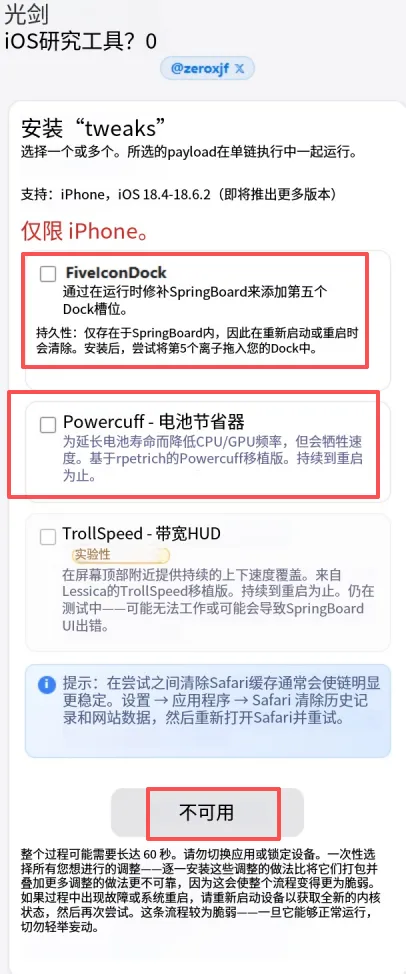 hello,大家好!最近开发者johnny又搞了新项项目FivelconDock,允许Dock栏存在5个App,且没有任何前置要求,打开网页注入就能实现。系统要求:仅支持iOS 18.4-18.6.2系统。后续或将支持iOS 16以上,静静等待就好!