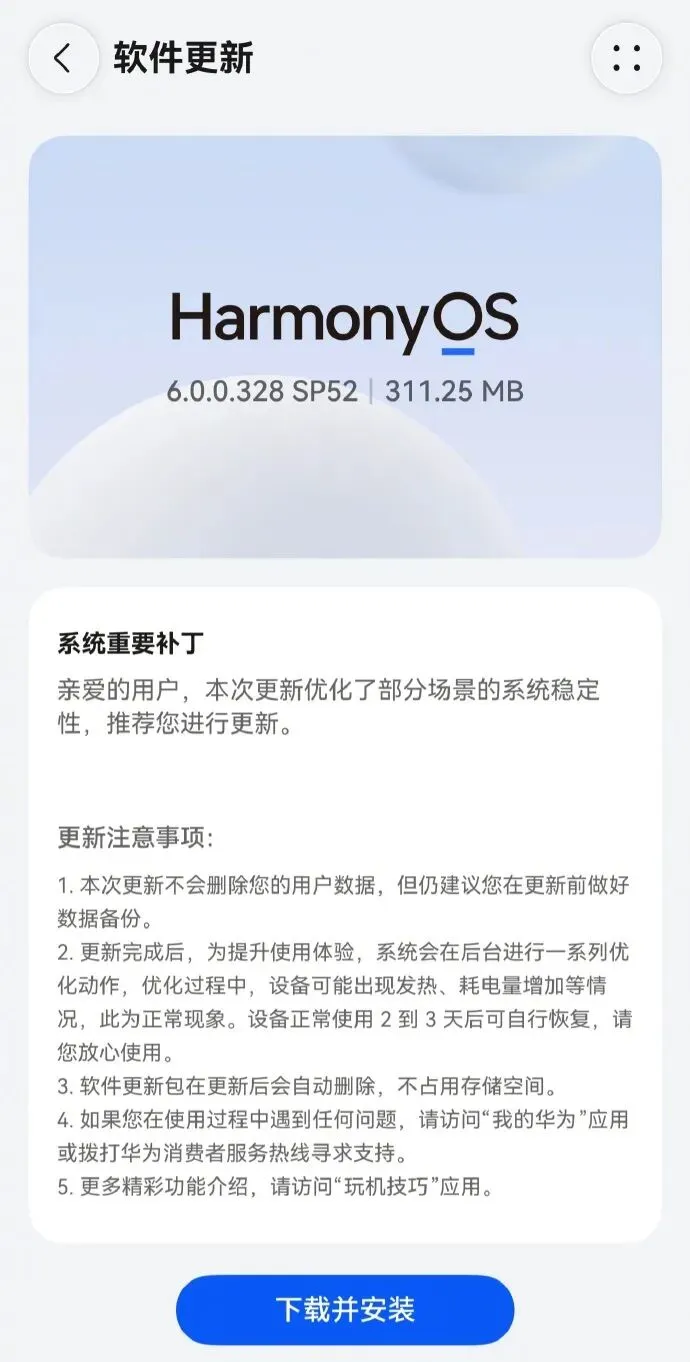 先简单说下这次更新的基本情况。SP52 补丁包大小约 315MB,属于稳定版优化补丁,目前已向 Mate 60/70/80 系列、Pura 70/80 系列、nova 系列以及多款平板设备分批推送。从网友反馈来看,大部分已升级到 328 基础版的机型,都能在 “设置 - 系统和更新 - 软件更新” 里收到推送。整个更新过程很快,也不会删除用户数据,更新完成后后台会自动优化,短暂发热耗电都属正常现象,不用慌。