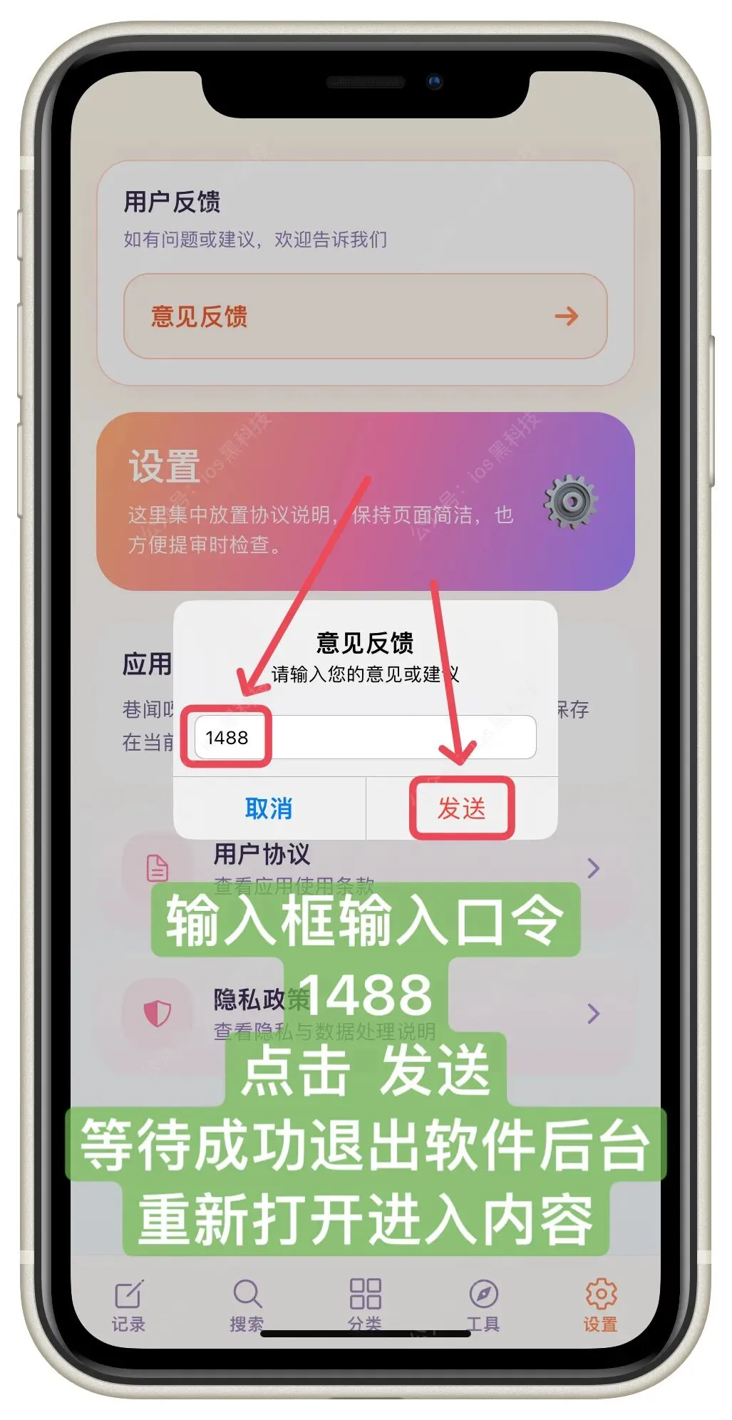 iOS -版: 首页-右下角设置-上方意见反馈-输入口令:1488 点击 发送-完全退出后台重新打开进入内容(如不行请退出后台多次重试即可)