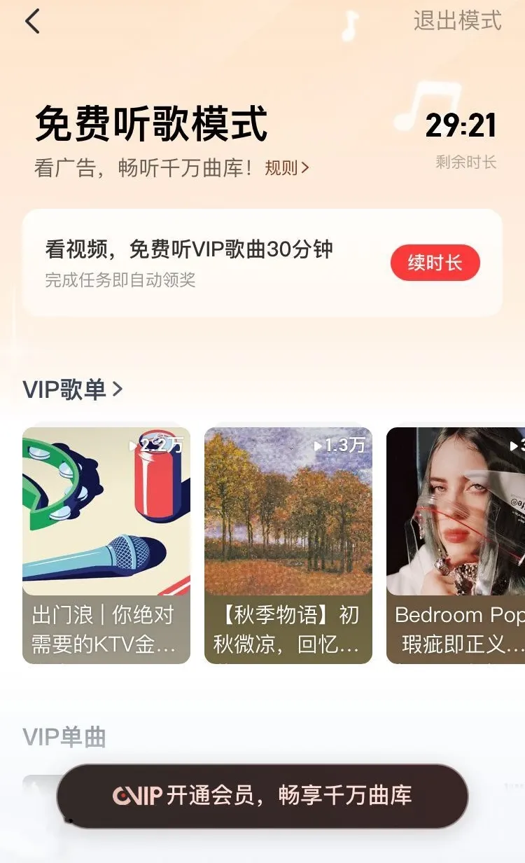 本次还推出了看广告免费听歌模式,是面向特定网易云音乐用户推出的一项激励活动。用户点击主页右上角的“免”字按钮进入“免费听歌模式”,也可随时退出该模式。看一次广告时长(比如 15s),可获得 30 分钟的免费听歌时间。