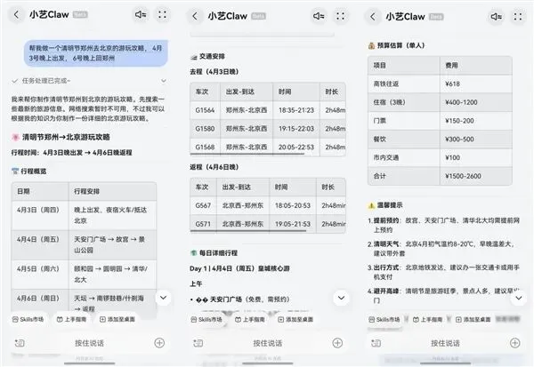 清明假期亲测,只需要跟它说 “4 月 3 号晚上从郑州出发去北京,6 号晚上返程,帮我做份游玩攻略”,它立刻就能整合高铁、景点、住宿、美食等核心信息,制定出详细的行程表,连每日景点顺序、交通方式、预算估算都标得清清楚楚。