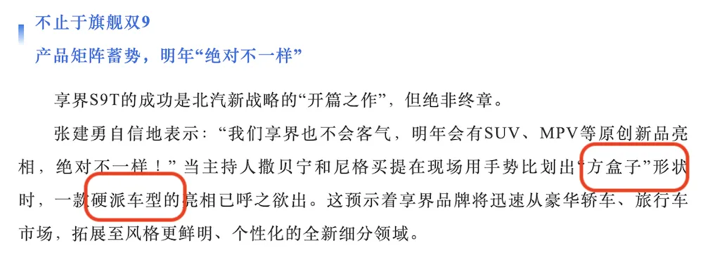 而由于鸿蒙智行当前在售车型中并无硬派越野SUV,业内据此推测,这很可能是鸿蒙智行即将亮相的新车。早在2025年12月9日鸿蒙智行年度直播中,华为常务董事、产品投资评审委员会主任、终端BG董事长余承东与北汽集团董事长张建勇就曾提到享界2026年的新车“外观内饰都有创新”,主持人撒贝宁更以“够飒”评价其造型。直播结束后,北汽集团官方发文确认,享界品牌SUV新车将采用“方盒子”造型。▲北汽集团发文确认享界会推出硬派越野