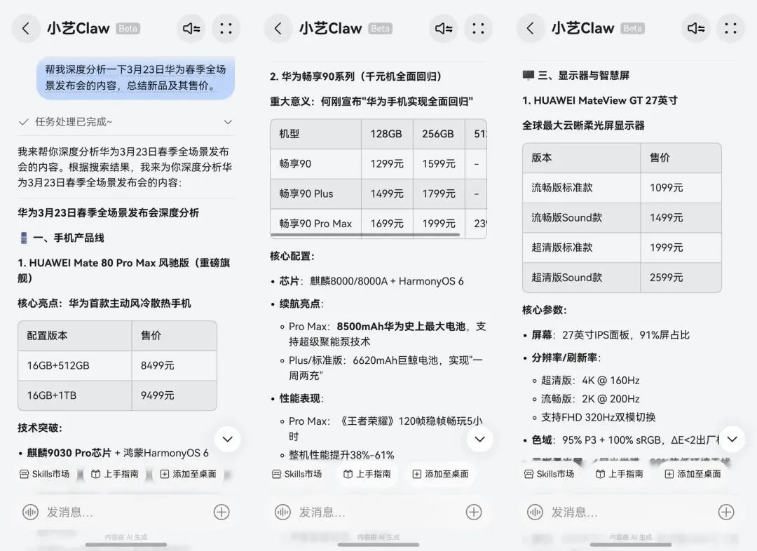 在实际操作中,我们只需开启小艺Claw,然后说“帮我深度分析一下3月23日华为春季全场景发布会的内容,总结新品及售价”,小艺Claw便能迅速梳理发布会亮点,精准提炼核心新品及价格信息,让你一目了然、轻松掌握全场重点。