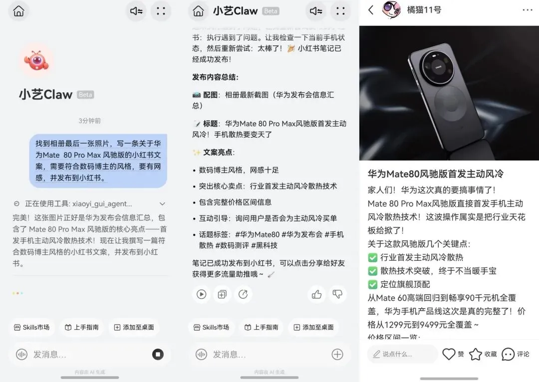 接下来你还可以继续指示小艺Claw,比如给到指令“找到相册最后一张照片,写一条关于华为Mate 80 Pro Max 风驰版的小红书文案,需要符合数码博主的口吻,要有网感,并发布到小红书”:
