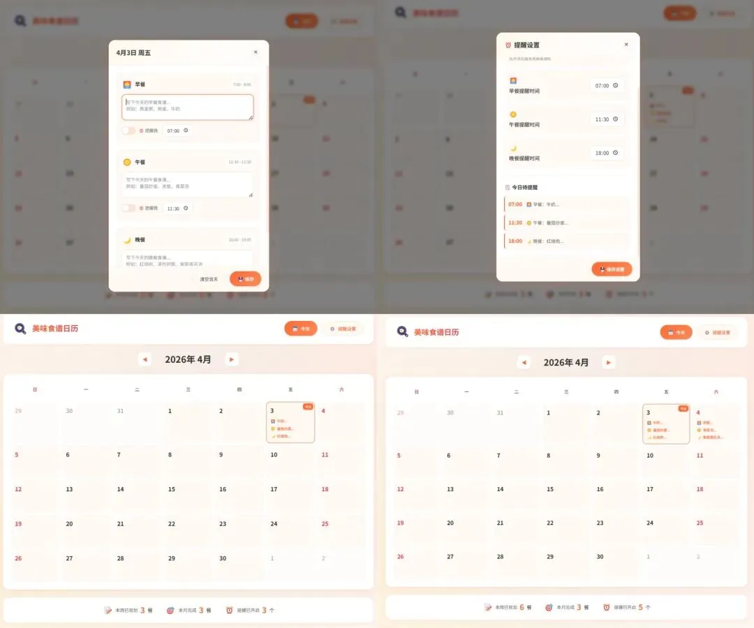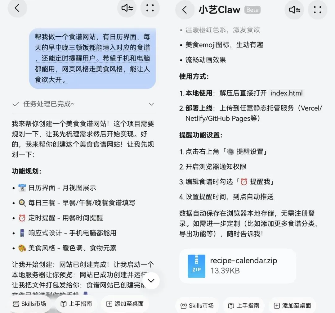 在小艺Claw的“skills市场”中,点击创意创作,找到并安装“前端UI/UX工程师”,输出指令词:帮我做一个食谱网站,有日历界面,每天的早中晚三顿饭都能填入对应的食谱,还能定时提醒用户。希望手机和电脑都能用,网页风格走美食风格,能让人食欲大开。