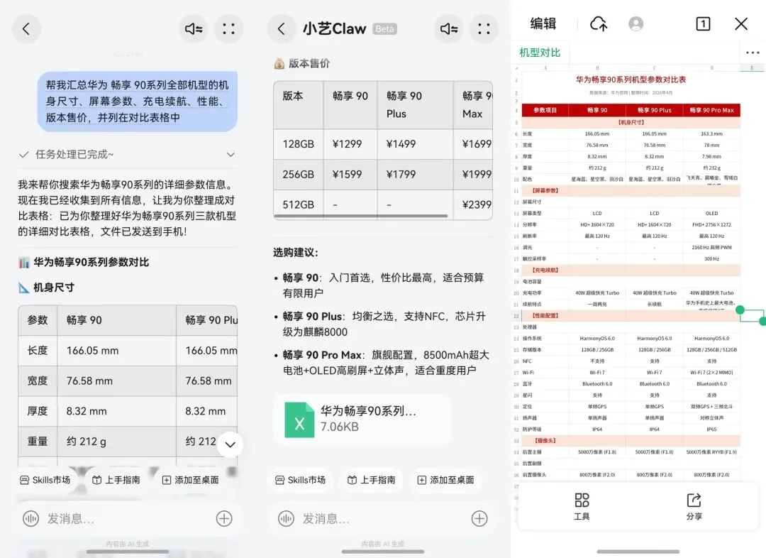 以华为畅享90系列为例,我们可以对小艺Claw说“帮我汇总华为畅享90系列全部机型的机身尺寸、屏幕参数、充电续航、性能、版本售价,并列在对比表格中”,小艺Claw就能生成如上图一样的清晰表格,省时省力,So Easy。